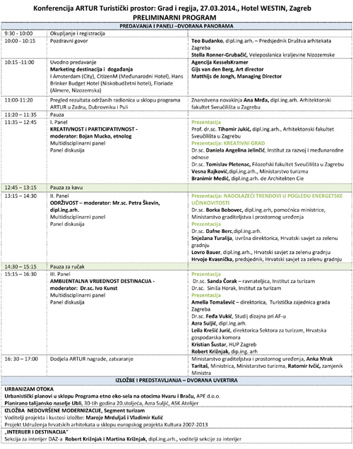 Ovogodišnju temu programa ARTUR Turistički prostor: Grad i regija zaključit ćemo završnom konferencijom koja će se održati 27. ožujka 2014. u Hotelu WESTIN, Zagreb.